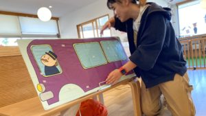 お天気の歌や月の歌を英語で歌ったり、大きなバスが完成するのを考えたり、今回の英語教室もハンナ先生とたくさん遊んだ子どもたち(^^♪