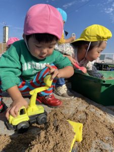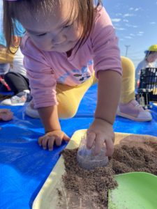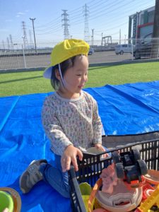 子どもたちは「ガーッ!!」とショベルカーで砂をすくったり、トラックに砂を積んで運んだりと、大忙しの工事現場のようでした!