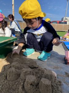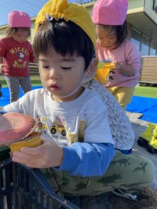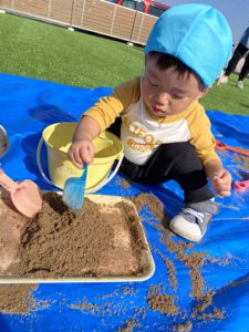 先週金曜日は園庭に特設の砂場を作り、みんなで砂場遊びを楽しみました!