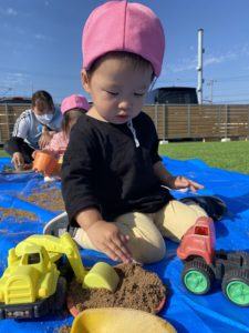 おっきなブルーシートにたくさんの砂を用意して、みんなで砂場遊びスタート♪