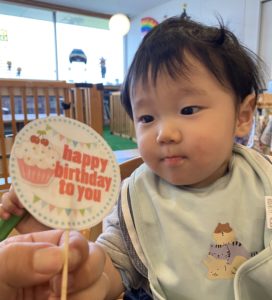 「だれのお誕生日?」と先生に聞いている様子がとても微笑ましいです。