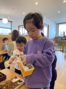 綿やどんぐりを次々に選んでいきます。