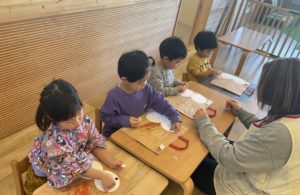 次はみんなでお散歩の時に拾ったドングリや松ぼっくりを使ってツリー作りです♪