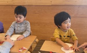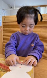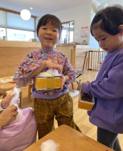 0,1,2歳児のクリスマスツリー作り①にじ組(2歳児クラス)のようす~お買い物ごっこをしてツリーを作りました~