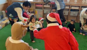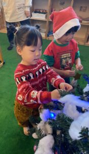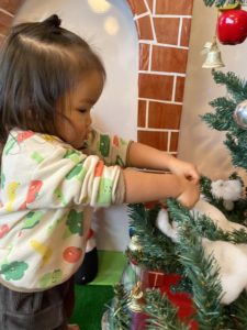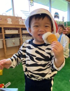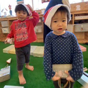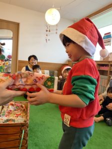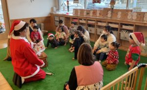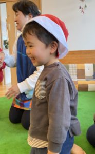 朝からサンタ帽子をかぶったり、「サンタさん来てくれるかなぁ」と先生とお話したり、クリスマス会を楽しみにしている子どもたち♪