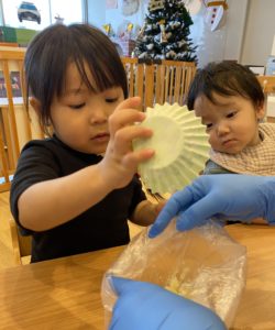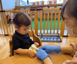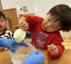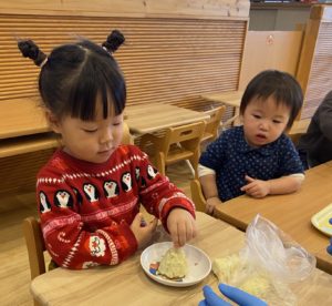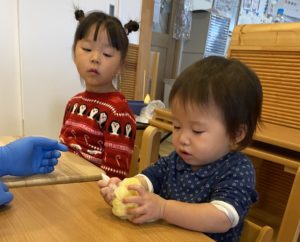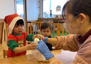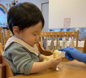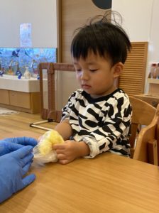 最初はやさしく触っていましたが、先生が大きなかたまりを教えてくれると力強く上手につぶしてくれました(*^^*)