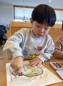 子どもたちのリクエストで先生が電車のぬり絵を用意してくれました。