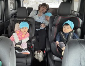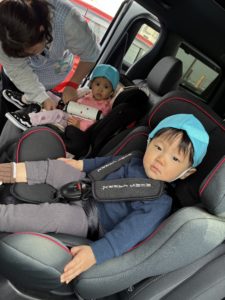 保育園の車にチャイルドシートを装着して、先生と一緒に出発!