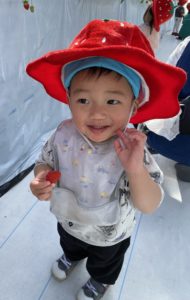 先生が採ってくれてニコニコ嬉しいけれどいちごを持ったままジーっとしている子。
