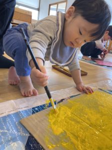 初めての絵の具に興味津々で、真剣な表情でぬりぬりする姿がとってもステキですね(^^♪