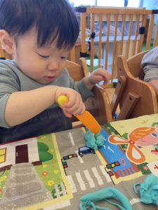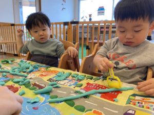おともだちが何をしているかジーっと観察したり、先生が丸めてくれた粘土をナイフでツンツン、ローラーでコロコロして遊びました(^^♪