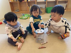 今日はうみ組(0歳児クラス)のお部屋遊びの様子を紹介します。
