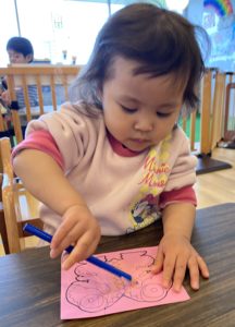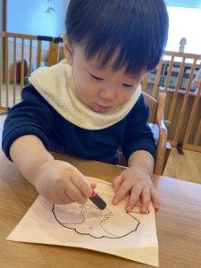 鉛筆やクレヨンを手にするのが嬉しくて、好きな色を選んで楽しみました。