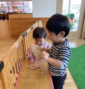 今まではなんとなく近くで遊んだりしていたのが、だんだんおともだちとコミュニケーションを取れるようになってきて、遊びの幅がどんどん広がっていくようです♡