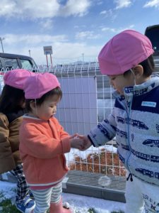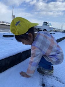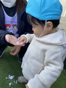 はじめは雪に触るのをためらっていた子も先生にさわらせてもらうと次は自分から触っていました(*^^*)