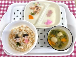 調理の先生が子どもたちのために作ってくれたおひなさまスペシャル給食はこちら♪
