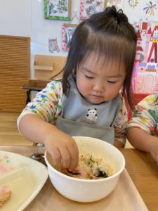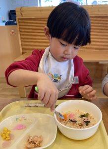 最後の仕上げは子どもたち自身でお花型のハムや桜でんぶなどをトッピングします(^^♪