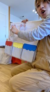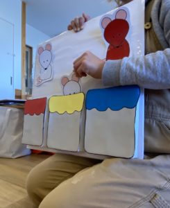 白いねずみさんが赤色や黄色、青色のポケットに入って出てくると。。。