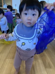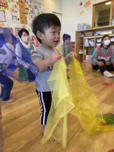 オーガンジーの布をフワフワ振って踊りながらグッバイ♪のお歌を歌いました(^^♪