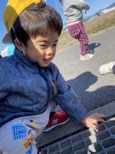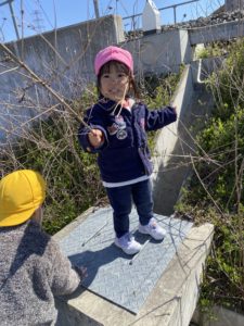 グレーチングに石をポチャンとして跳ね返ってくる水や音を楽しみました。