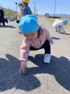石でアスファルトにお絵描きをしたり