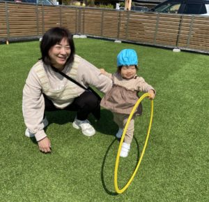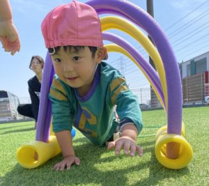 園庭の芝生の触感を楽しんだり、先生と一緒に列車ごっこをしたり♪