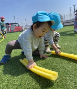 初めは少し緊張気味にお友だちが遊ぶ様子を見ていた子も、先生と手をつなぎ、