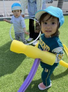 初めは少し緊張気味にお友だちが遊ぶ様子を見ていた子も、先生と手をつなぎ、