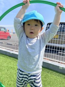 園庭の芝生の触感を楽しんだり、先生と一緒に列車ごっこをしたり♪