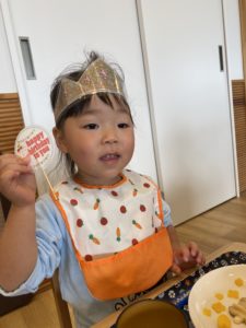 この日はお誕生日が嬉しくて朝のおやつの時間も、室内遊びの時間もずっと王冠をして過ごしていました。