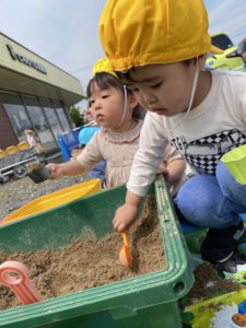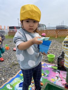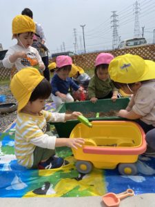 たくさんのおもちゃと砂場を出してもらって子どもたちはそれぞれ好きな遊びをみつけて楽しみます(^^♪