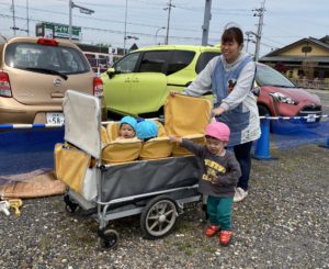うみ組(0歳児クラス)は園庭まででも安全のためにカートに乗って移動します。