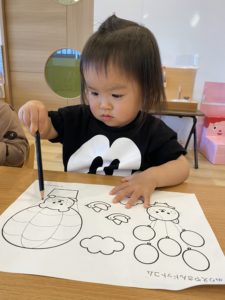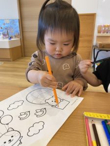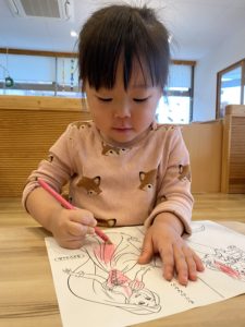 にじ組(2歳児クラス)の子どもたちは好きなキャラクターもはっきり言えるようになり、自分で好きなぬり絵を選んで集中して楽しむことができます。