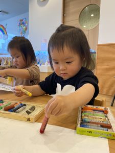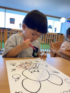 ぬり絵をしている時は個々の活動のように見えますが、子どもたちはお隣のおともだちや年上のおともだちの様子をちゃんと観察していて、どんどんできることが変化していきます。